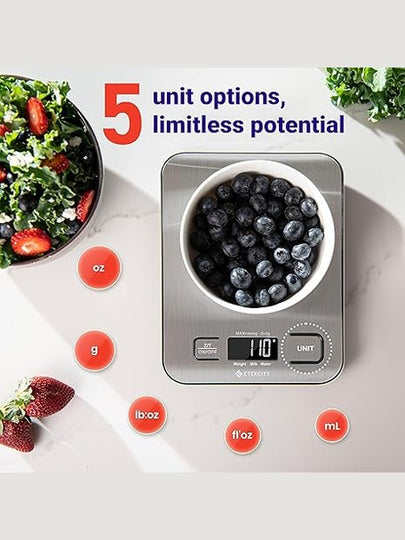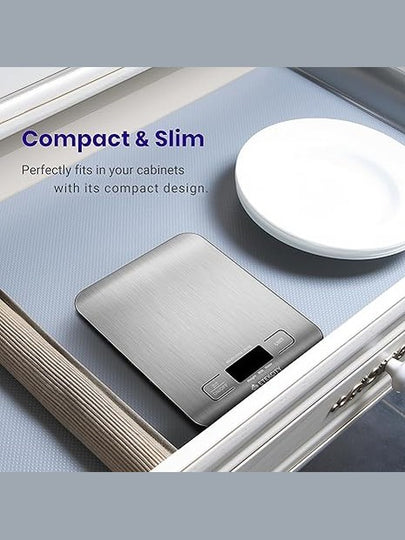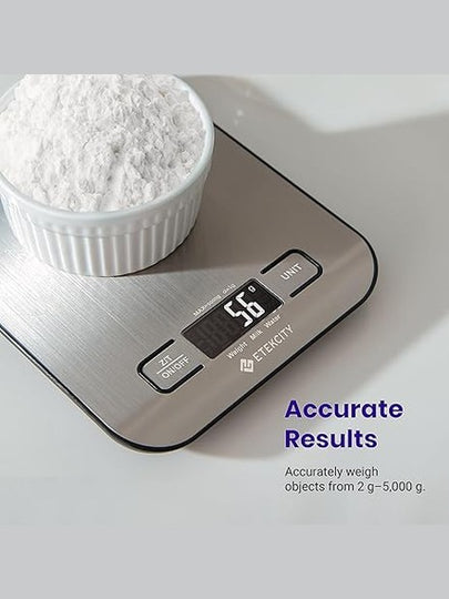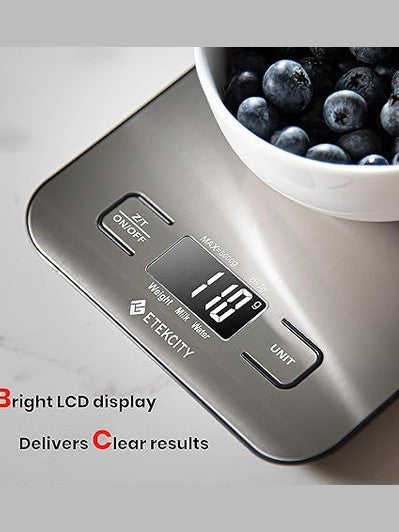 Details This Etekcity digital scale has endless uses for personal or commercial environments - great for homes, kitchens, offices, and more. The scale has an easy-to-read LCD display with beautiful clear backlit. With a capacity of 11lb (5kg), you can weigh a variety of items with ease. You will be surprised at all the uses you will have for this product.Weighing FunctionsYou can easily choose among measurement in oz, lboz, g, ml (Milk & Water), fl'oz (MilkWater). This digital scale measures in precise increments of 0.05oz (1 g) to accurately weigh your items. Power is provided by 2 AAA batteries (included), making the scale portable and ensuring that you can easily acquire replacement batteries.Tare FunctionThe tare function allows the user to deduct the weight of a container from the total weight in order to determine the net weight of the contents excluding the weight of the container which holds them.Clear Display and Auto-offThe scale has an easy-to-read backlit display, staying 30 seconds for easily reading. To save energy, the scale also features an auto-off function, allowing the scale to turn off after 2 minutes inactivity. Do not mix new and used batteries to power the deviceSpecificationsWeight Capacity 176oz 5000g 11 lbsUnits g oz lboz ml (Milk & Water) fl'oz (MilkWater).Measurement Increments 1 gMinimum Measurement 2 gAuto-Off 2 MinutesPower 2 x AAA 1.5V DCDimensions 7.3 x 5.7 x 0.6 inchesPackage Contents1 x Digital Kitchen Scale1 x Quick Start Guide2 x AAA 1.5V DC batteriesDo not mix new and used batteries to power the device.
