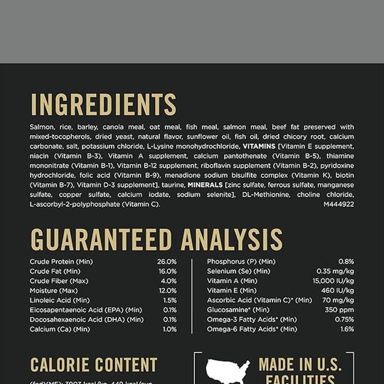 • High protein dog food formula, with real salmon as the first ingredient, made without artificial colors or flavors