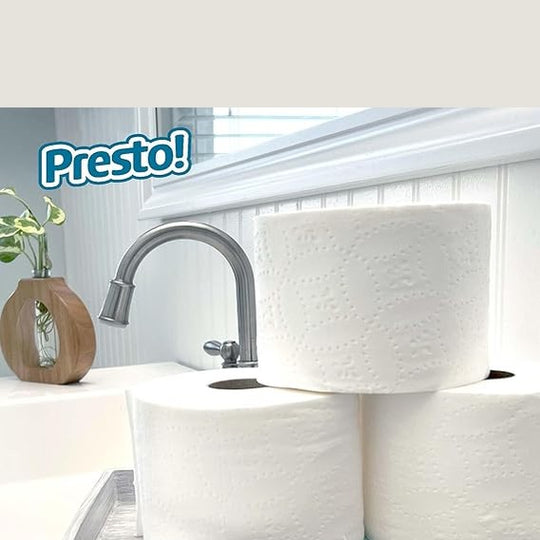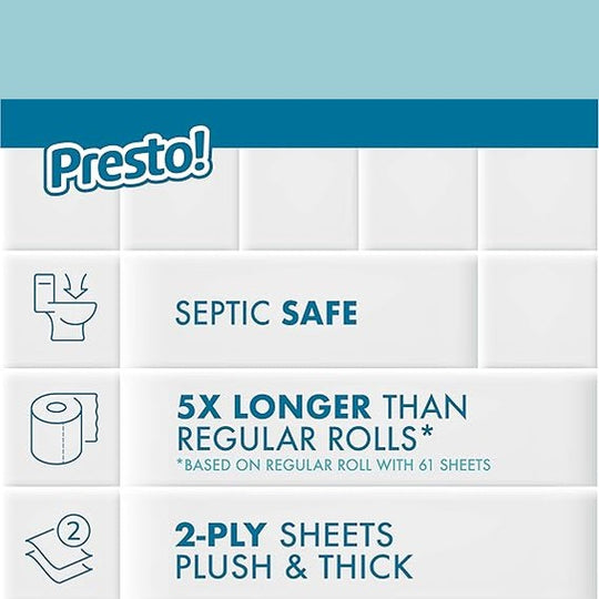 Details Presto! Ultra-Soft Toilet Paper offers great softness with the strength you need. This septic-safe bath tissue leaves less lint behind versus the leading ultra-premium soft brand, based on laboratory testing. Each mega roll lasts 4.5X longer than a regular roll of toilet paper (based on a regular roll with 66 sheets). Presto! Ultra-Soft Toilet Paper is PEFC certified. Mega Rolls are our longer-lasting rolls.