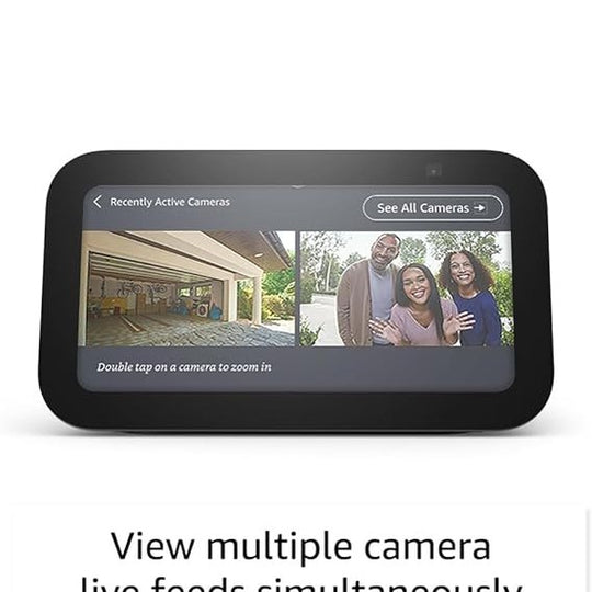 - See more with the built-in camera Check in on your family, pets, and more using the built-in camera. Drop in on your home when you're out or view the front door from your Echo Show 5 with compatible video doorbells.