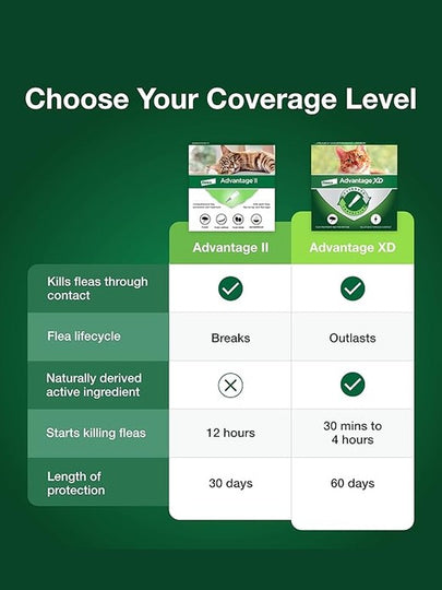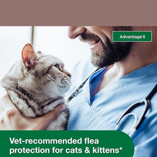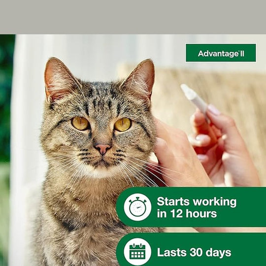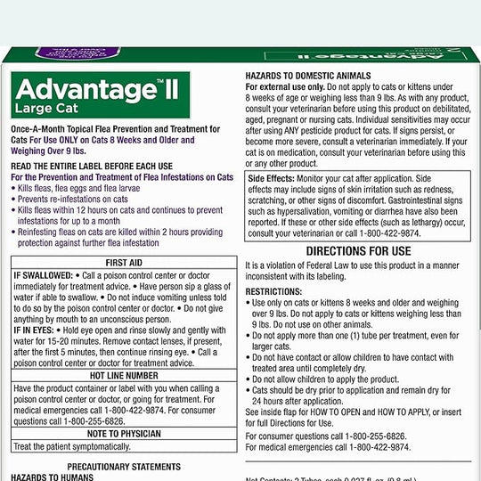 Details Advantage II Large Cat is a vet-recommended, leading brand in cat flea protection. Advantage II Large Cat flea treatment and prevention kills adult fleas, flea larvae and flea eggs to deliver total flea protection to your cat or kitten. Within 12 hours of application, Advantage II Large Cat topical treatment gets straight to work killing fleas through contact, so they dont have to bite your cat to die. This treatment works hard for 30 days following application, effectively breaking the flea life cycle, controlling existing flea infestations and preventing further infestations all month long.Fleas not only cause discomfort; they can also pose other health risks. Monthly use of Advantage II Large Cat is important to protect your cat against fleas that may cause transmission of tapeworms, Flea Allergy Dermatitis and flea bite anemia.Thats why Advantage II Large Cat makes applying treatment simple. This convenient, spot-on application goes on the back of your cats neck at the base of the skull. Youll simply place the tip of the tube on the skin and squeeze the tube to expel the entire contents directly on the skin. It goes on in seconds! It's easier than a flea collar and there are no hard-to-swallow pills. Youll also love that Advantage II Large Cat is fragrance-free and waterproof after 24 hours of application. Check the product label for information on application and potential side effects.Advantage II Large Cat flea protection is effective on both indoor and outdoor cats. Your cat should be at least 8 weeks old and weigh over 9 lbs. to use Advantage II Large Cat.For the ultimate convenience in care, Advantage II Large Cat is available over the counter no prescription needed. And, you can stock up with a subscription for regular doorstep deliveries so you never miss a monthly treatment.Advantage II Large Cat is a trademark of Elanco or its affiliates.