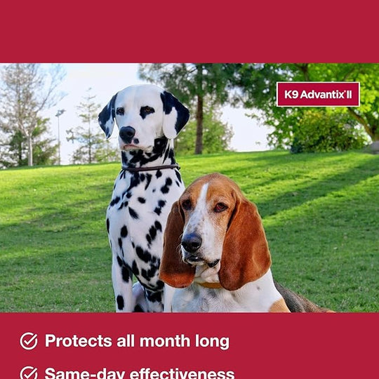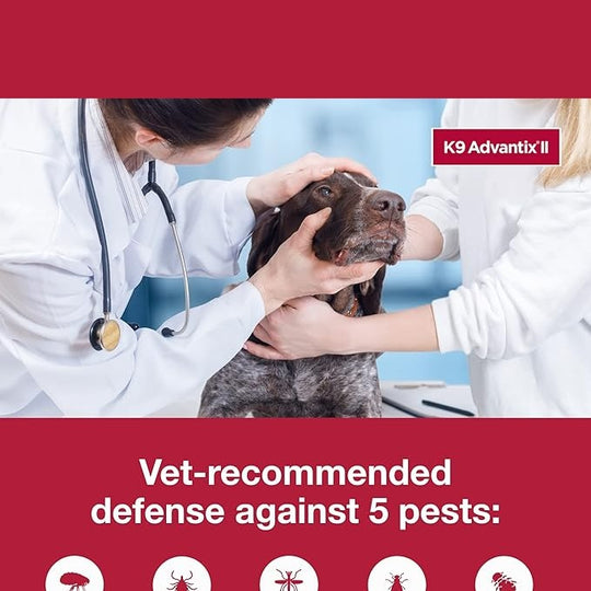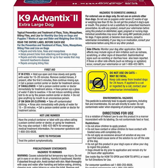 Details K9 Advantix II Extra Large Dog is the veterinarian-recommended formula that helps defend your dog against five pests fleas, ticks, mosquitoes, biting flies and lice. And unlike other treatments, K9 Advantix II kills and repels fleas, ticks and mosquitoes. K9 Advantix II topical treatment gets straight to work killing fleas on dogs within 12 hours of initial application. This formula stops existing flea infestations and prevents new ones by killing adult fleas on contact so they cant lay eggs and they dont have to bite your dog to die. Fleas, ticks, mosquitoes and other pests not only cause discomfort; they may also transmit disease. Monthly use of K9 Advantix II is important to protect your dog against fleas that may cause transmission of tapeworms. This formula also kills fleas which may cause Flea Allergy Dermatitis and flea bite anemia. Thats why K9 Advantix II Extra Large Dog topical, spot-on formula makes application simple - going on in seconds. It's easier than a flea collar and there are no hard-to-swallow pills. Youll also love that K9 Advantix II is fragrance-free and waterproof after 24 hours of application. Check the product label for information on application and potential side effects. K9 Advantix II pest protection is effective on both indoor and outdoor dogs. Your dog should be at least 7 weeks old and weigh over 55 lbs. to use K9 Advantix II Extra Large Dog. For the ultimate convenience in care, K9 Advantix II is available over the counter no prescription needed. And, you can stock up with 2-dose, 4-dose and 6-dose packs so you never miss a monthly treatment. Once K9 Advantix II is applied, your dog is ready to get right back to big-pup cuddles and racing around the park. K9 Advantix II Extra Large Dog is a trademark of Elanco or its affiliates.